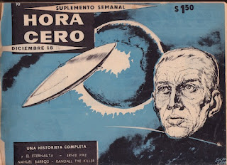 El tiempo, o las distintas nociones que puedan tenerse de él, es una herramienta narrativa que Héctor Germán Oesterheld y Francisco Solano López ubicaron en el corazón de El Eternauta, la historieta que comenzaron a serializar en septiembre de 1957, con el lanzamiento de la revista Hora Cero Semanal. Juan Salvo, el protagonista que devendrá ese peregrino de la eternidad que será bautizado como El Eternauta por un filósofo del futuro, carga sobre sus hombros el paso (y el peso) del tiempo. Cuando se corporiza en la silla del por entonces anónimo guionista de historietas, que con el tiempo se asumirá como el propio Oesterheld, la peripecia particular de Juan Salvo es pasado. Sin embargo, para el guionista que escucha impávido las alternancias del relato, todo se refiere a su futuro. Más allá del juego de palabras y la tensión que logra articular la historieta, este manejo conceptual del tiempo eclosiona sobre el final, cuando protagonistas y lectores descubrimos que aquella pesadilla a la que hemos asistido por más de 300 páginas no ocurrió, sino que acontecerá dentro de cuatro años.